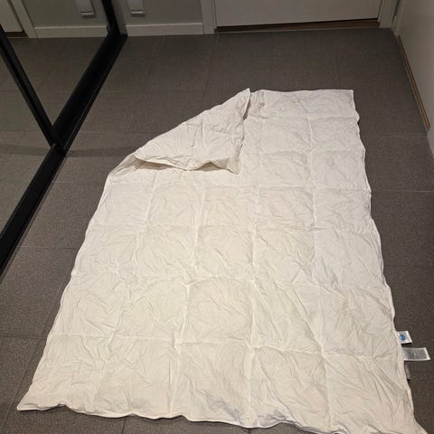 Yttertrekk er i 100 % bomull. Fyll er 90 % dun og 10 % små fjær. Knapt brukt.
