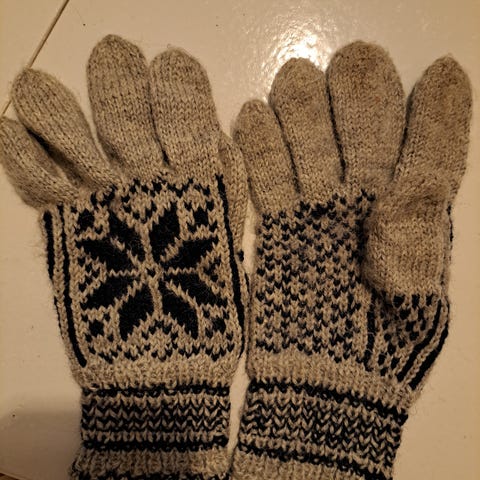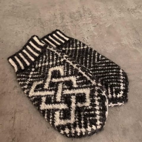Helt nydelige ullvotter i Selbu-mønster i svart og hvitt. Vil tro de passer en mann med normale hender. De er hjemmestrikket, men knapt blitt brukt.
