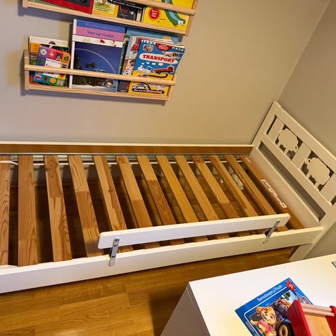 IKEA Juniorseng barneseng i hvit farge. Designet for barn, egnet som overgangsseng fra barneseng til vanlig seng. Madrass medfølger.
