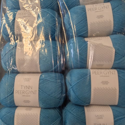 Tynn Peer Gynt garn i lys grå farge. Fire nøster med mykt garn egnet for strikking og andre håndarbeidsprosjekter.