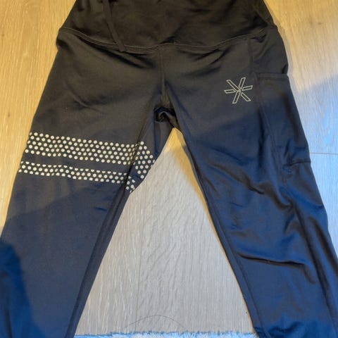 Svart, løpe track, treningsbukse med meshfor og glidelås ned leggen. 2 glidelås lommer. Knyting + strikk i livet. Gummikant på innsiden av midja. Trekant reflekslogo. Strikk nederst på bena. 100% polyester.