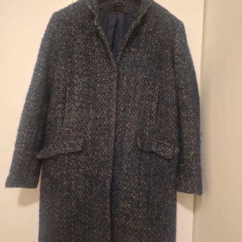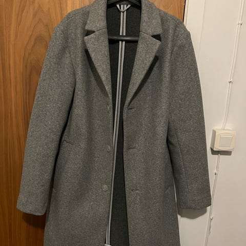 H&M-frakk i størrelse M, laget av ullmateriale. Frakken er mørkegrå . Den har dobbelspent knappelukking og foret innside, egnet for utendørs bruk i kaldere vær. Kjøpt i 2010. Nypris den gang var kr. 1000,-. Reparert søm ved et par anledninger