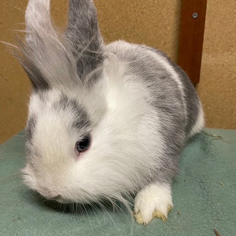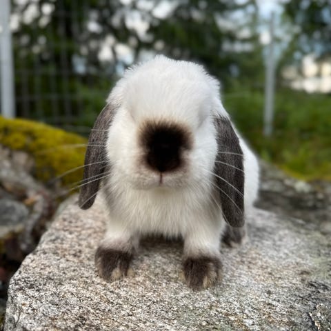 Fire søte små kaninunger gis bort. En er mørk grå, en rød og to lys grå. Det er dvergkaniner, mest Hermelin, men bestefar er Dvergveder.
