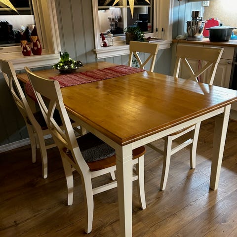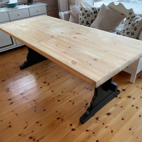 Spisebord 240*99 cm med seks stoler. Det medfølger to klaffer a 50 cm slik bordet totalt kan bli opp til 340 cm. Møblene er levert av Hilmers Hus. Møblene står på ei hytte på Sinnes i Sirdal kommune slik henting må avtales og fortrinnsvis i en helg.