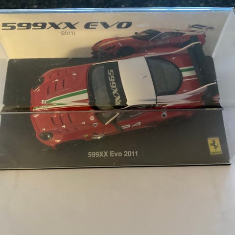 Ferrari FXX K 2014 bilmodell i rød farge. Modellen viser detaljer som svart tak og hvite striper på siden. Egnet som samlerobjekt eller dekorasjon. Størrelse 1:43 usikker på utgiver