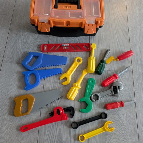 Verktøykasse til barn med drill, sag, hammer etc. Nesten ubrukt.