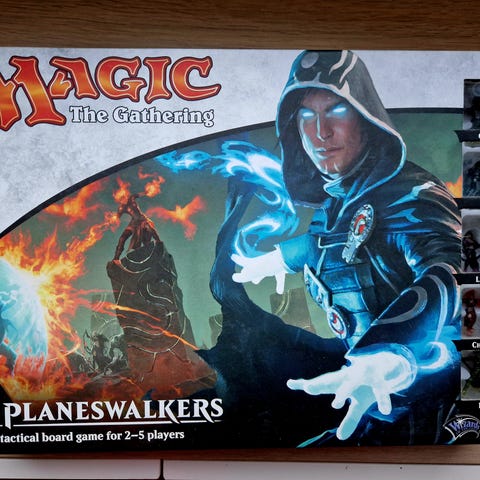 The Gathering Planeswalkers brettspill med spillbrett, figurer, kort og terninger. Brettspillet inkluderer en brett med hexagonale ruter, flere fargede spillbrikker, og illustrerte kort ☺️ For 2 til 5 spillere ☺️