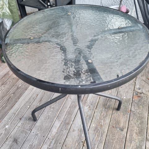 Utemøbel bestående av et sofabord med glassplate og en stol gies bort. Bordet har en ramme i flettet materiale, og glassplaten er montert på toppen. Matchende stol. Egnet for utendørs bruk. Tilhører serien «Larkollen» fra Europris. Må hentes på Torshov.