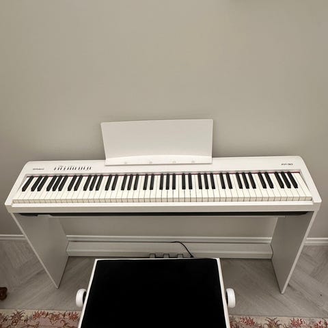 Roland FP-10 piano med 88 vektede tangenter. Bluetooth tilkobling til tablett/smartphone. Kjøpt hos musikkkompaniet i Ålesund i 2024, selger det da det blir alt for lite brukt.