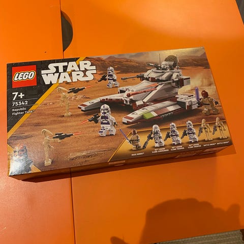 LEGO Star Wars 75342 Republikens Fighter Tank™ byggesett. Inkluderer minifigurer av klonekommandør, klonesoldater og andre karakterer. Passer for Lego/Star Wars entusiaster, samlere og barn fra 7 år og oppover. Modellen representerer et kjøretøy fra Star Wars-universet, designet for samling, utstilling eller lek. Settet er gått ut av sortimentet til Lego og kan være vanskelig å finne i uåpnet eksemplar.