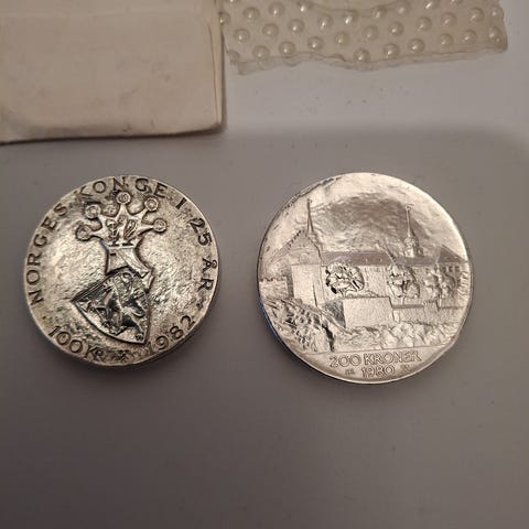 Mnnemedaljer i bronse. Medaljene er oppbevart i etui med logo og tekst. Medaljen har et motiv av Akershus festning, mens bronsemedaljen viser en portal eller inngangsparti. Egnet for samling eller utstilling.