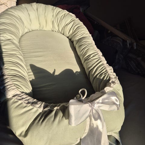 Nydelig babynest i beige, med hvit silkesløyfe og skråbånd foran. Vidas babynest gir babyen en trygg og myk start på livet. Designet og håndlaget i Norge!