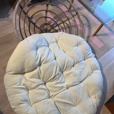 Granit Papasan stol laget av rotting med en stor, hvit pute. Nesten ubrukt, ingen synlige merker. Stolen er i to deler slik at man kan justere sittestillingen.