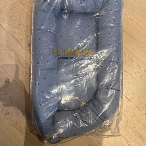 Nydelig babynest i blå farge, brukt kun 3 mnd. av et barn. Veldig praktisk, alt kan vaskes (nyvasket)