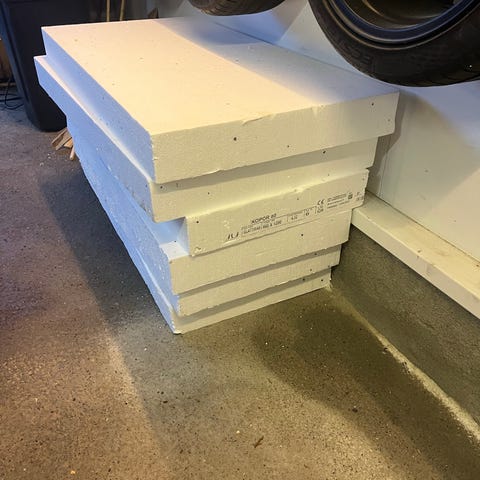 Isoporplate gis bort. Ca 234x115 cm. Tykkelsen varierer fra 12cm tykk langs den ene langsiden og 7,5 cm den andre. Må hentes.