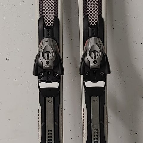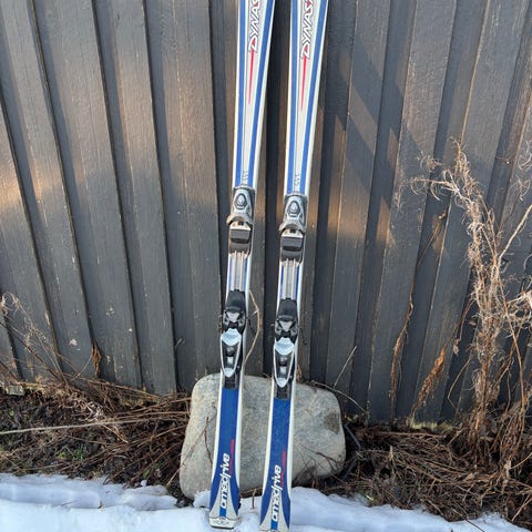 Ski og bindinger er godt vedlikeholdt, lagret tørt og pent brukt.