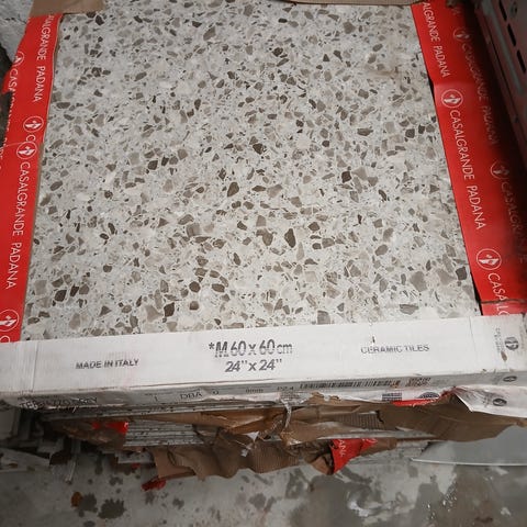Keramiske gulvfliser med svart og hvitt mønster, størrelse 20x20 cm. Flisene har et dekorativt design og egner seg for gulvbruk. 23 stk