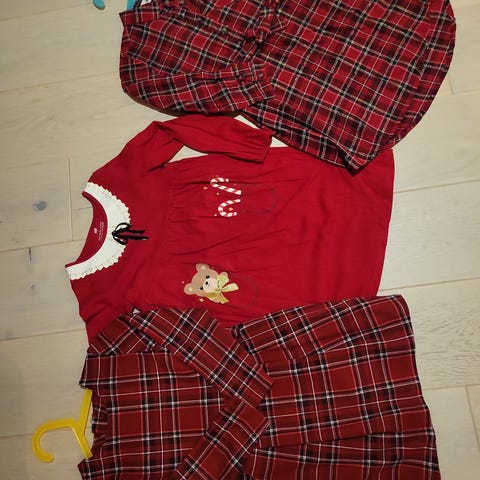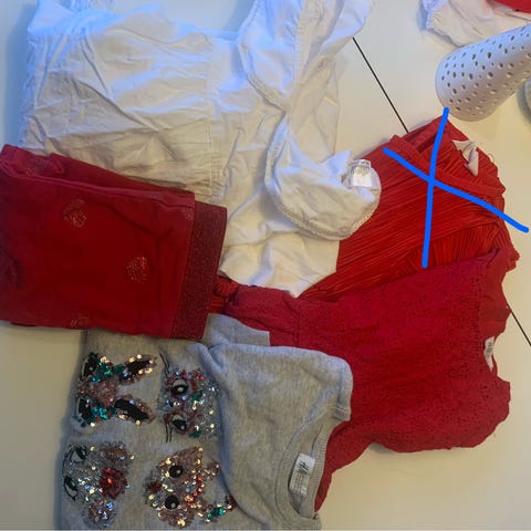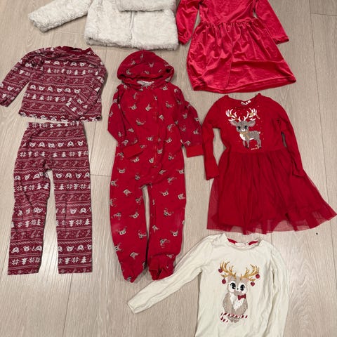 Klespakke «jul» med 3 kjoler, 2 topper, 1 genser, 1 strømpebukse og 1 nisselue. Uten hull/merker.