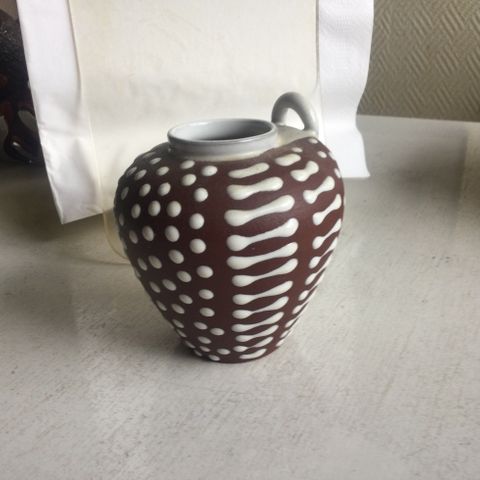 Dette er en liten, brun keramikkrukke fra Ekeby Keramik, muligens i retrostil.
