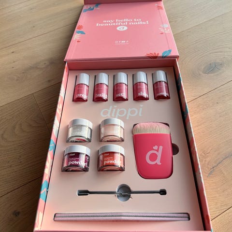 Dipsy Nude Dypowder Manikyrsett inneholder flere flasker med dypowder i forskjellige farger, top coat, aktivator, base coat, børste og annet tilbehør for neglepleie. Produktet er designet for bruk til manikyr og negleforsterkning.