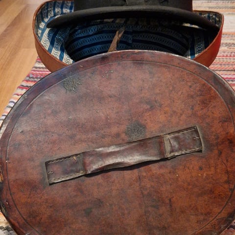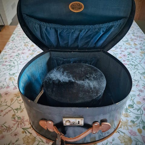 Stilig eldre flosshatt selges. Hatten er sammenleggbar. Alder: Arv fra min farfar som døde 1955. Stiligere blir det neppe. Kom med bud.