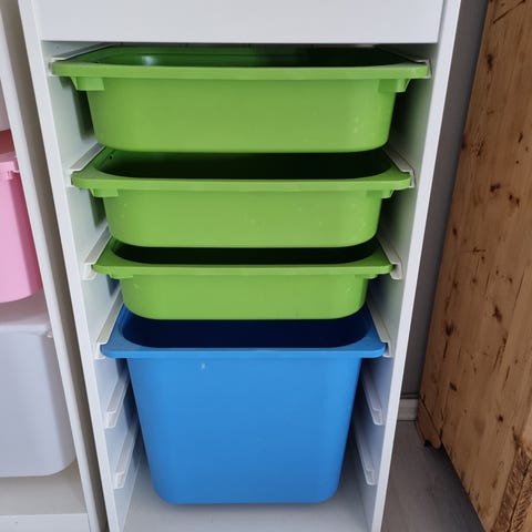 IKEA Busunge barnegarderobe i rosa farge. Garderoben har to dører og flere oppbevaringsrom innvendig, egnet for oppbevaring av klær og sko til barn. Organizer følger med.