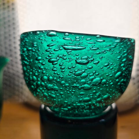 Hadeland, Grønland, signert, grønn glasskål, munnblåst glass, bobleglass, norsk design, skandinavisk glass, vintage glass