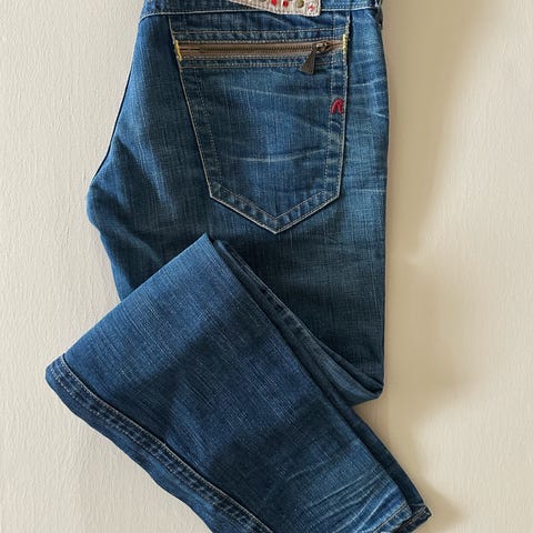 Superkule retro Replay jeans. Det står Waist 25, noe som av erfaring kan tilsi midje på 63,5 cm.