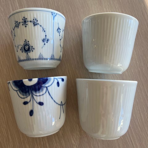 Ministrå kaffekopper med tilhørende skåler, laget i porselen med blå dekor. Nypris samlet er 2290kr. Selges samlet for 800kr. Hentes på Fornebu.