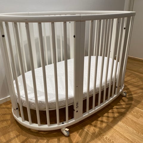 Roomie Glide bedside crib fra Joie med en justerbar bunn. Den har en justerbar høyde med 11 nivåer og et vaskbart trekk. Bedside crib-en har en langside som kan heves og senkes med én hånd, doble nettingvinduer for god ventilasjon og vuggebevegelser som kan låses med en knapp. Fire låsbare, gummibelagte hjul for enkel transport og One-Touch glidelås som holder sengen godt på plass.