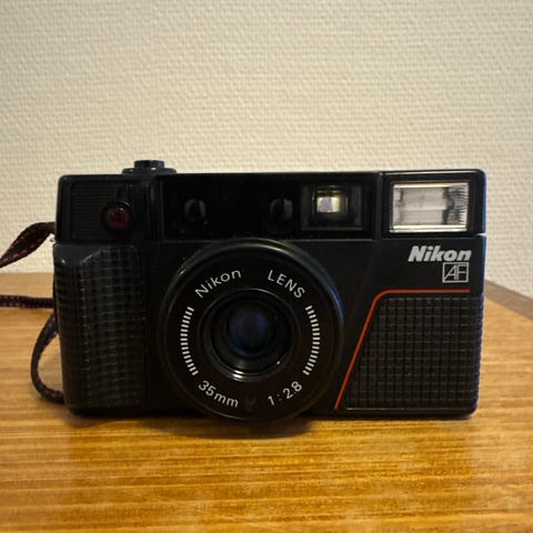 Nikon L35 AF kompaktkamera med innebygd blits og 35mm filmformat. Kameraet har manuell og automatisk eksponering, og er utstyrt med et 35mm f/2.8 objektiv. Leveres med originalt kameraveske og skulderrem. Ingen kjente feil eller mangler, ingen synlig slitasje eller skader. Er veldig lite brukt og har alltid vært oppbevart i vesken.
