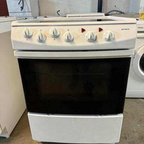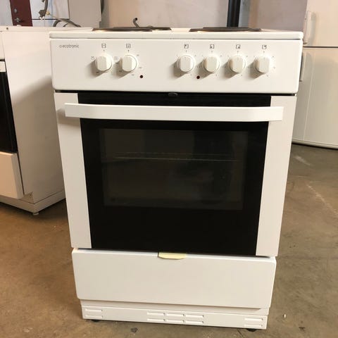 Blomberg keramisk komfyr med keramisk kokeplate. Komfyren har ovnsrom med rist og brett, og betjenes med manuelle knotter. Fargen er hvit.