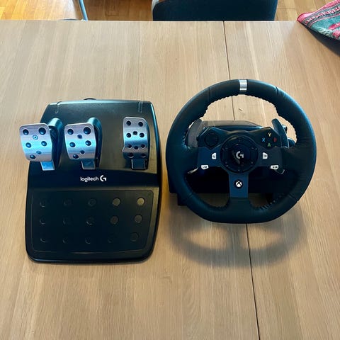 Logitech G923 Racing Wheel med pedalsett. Inkluderer ratt med innebygde knapper og pedalsett med tre pedaler. Designet for simulert kjøring med realistisk følelse og respons.