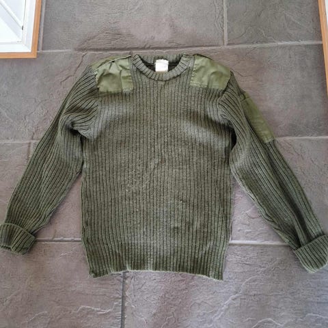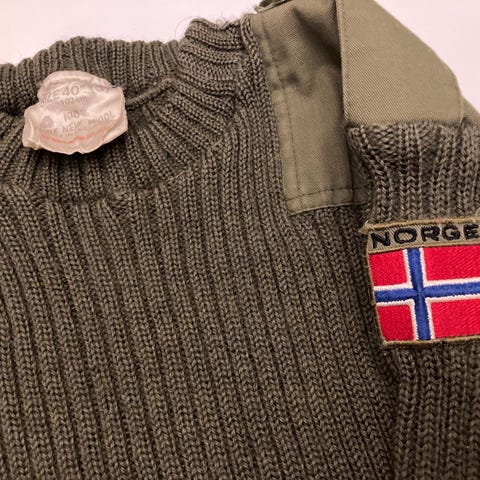 Norge genser med forsterkninger på albuer og skuldre i olivengrønn farge. Strikket ull med ekstra slitesterke stoffdetaljer. Størrelse Small.