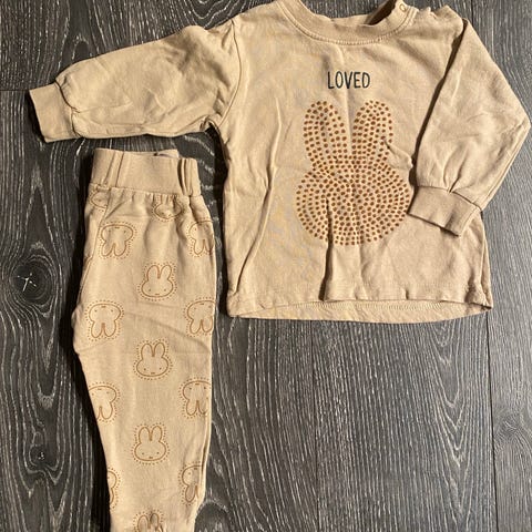 Kappahl sett i str 80 med kaninprint selges. Har noen små flekker som er ubetydelig for bruken, ikke forsøkt å fjerne de, kan kanskje gå vekk med sitronsåpe. Selges derfor billig