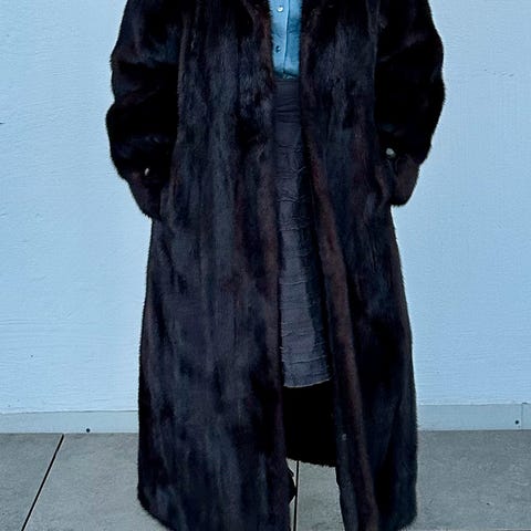 Minkpels, størrelse L, farge brun. Plagget er laget i minkpels