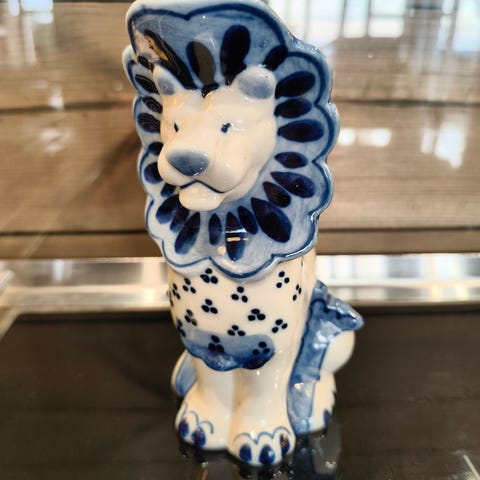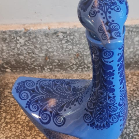 Original Gzhel porselens-shtof «Stør», dekorert i klassisk blå-hvit Gzhel-maling. Figuren forestiller en stilisert stør – et tradisjonelt og gjenkjennelig motiv innen Gzhel-porselen.