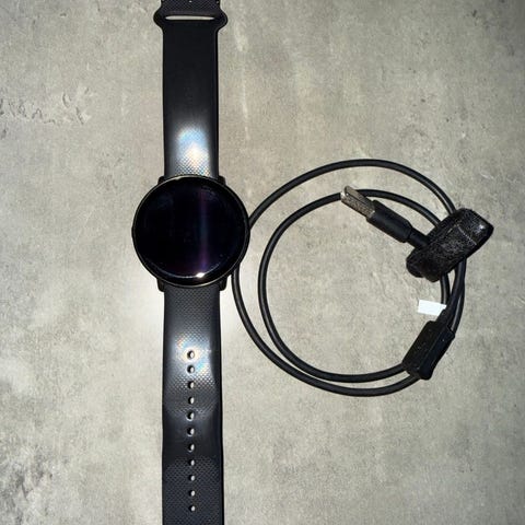 Polar Ignite 3 smartklokke med svart silikonrem i størrelse S-L. Klokken har funksjoner for trening og helseovervåking, og leveres med lader og ekstra rem i pakken.
