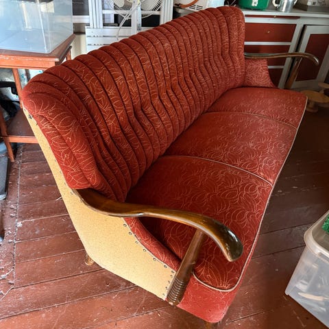 Flott sett bestående av en vintage sofa, to lenestoler og puff. Møblene har stofftrekk med mønster og detaljer i skinn på armlener og rygg. Treverket på bena har utskjæringer.