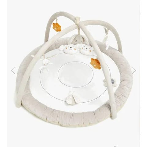 Done by Deer babygym med hengende leker i nøytral farge. Babygymen har en buet ramme med tre myke leker festet som kan stimulere og underholde babyer. Buen er justerbar og enkel å flytte på.