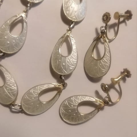 Selger et pent sølv emalje sett, bestående av Halskjede og Øredobber i samme serie. I hvit emalje med mønster, og med gullforgylt kant og bakside. Stemplet. 925S.HP (mesterstempelet til Harry Pedersen). Halskjedet har lengde 42 cm Øredobbene henger ned, og er med skrue bak. Smykkesettet er i god stand. Selger for 1150 +frakt