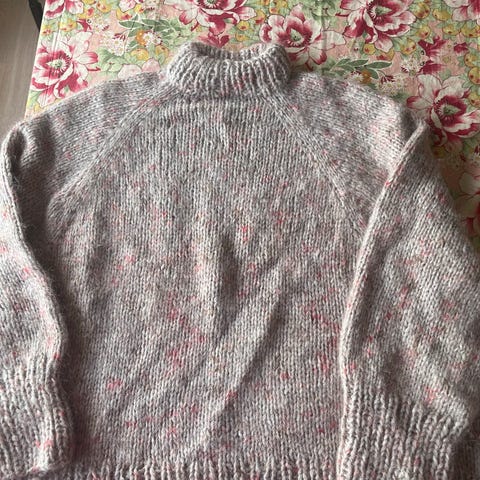 Myk og superlett. Varm, rød farge med detaljer av gull-garn på vrangbordene på armer og bol. Aldri brukt, bare prøvd på. Selges pga for stor.