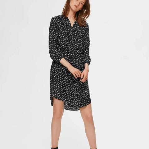 Lekker kjole fra Selected Femme. Veldig søte, små puffermer. Innsydd knytebelte i midjen. V-hals med knytebånd, og ermer med god vidde. Sort med hvite prikker og mønster i hvitt og rosa. Kjolen leveres skånsomt vasket og klar til bruk.