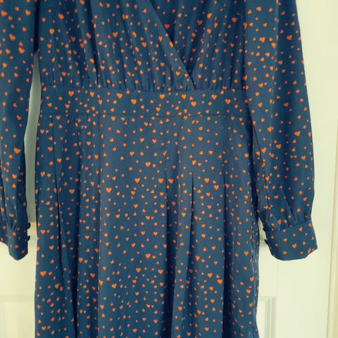 Kjolen er pent brukt. Str. 34, men veldig stor i størrelsen. Tror den kan passe både str. 36 og 38. Brystmål fra armhule til armhule er 50 cm, midjemål fra side til side er 44 cm og hel lengde fra skulder og ned er 89 cm. 100% viskose.