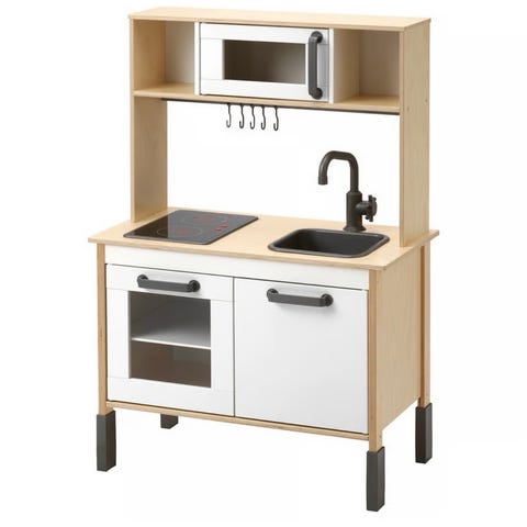 IKEA Leksvik lekekjøkken barnemøbel med svart vask, komfyr med to kokeplater og ovn. Kjøkkenet har en hvit marmormønstret benkeplate og mørk blåe skap med håndtak. Passer for barn til lek og rollelek.