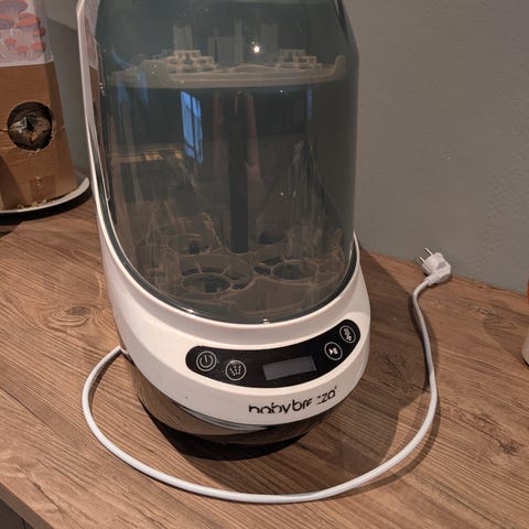 Baby Brezza Bottle Washer Pro gir deg vasking, sterilisering, og tørking av flasker, drikkekopper, og pumpedeler med et knappetrykk. 20 høyttrykkstråler med vann fjerner melkerester, mens dampsterilisering dreper bakterier, etterfulgt av HEPA-filtrert lufttørking. Flaskevaskeren er BPA-fri, har plass til opptil fire flasker Maskinen er brukt i et halvt år, og selges da det ikke er behov for den lenger.
