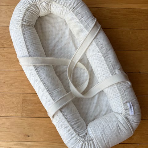 Liewood babylift i beige farge med hvite prikker. Babynestet har bærereimer for enkel forflytning og justerbar snøring for tilpasning av størrelse. Litt opprevet i stoffet ved noen av håndtakene, se bilder. Kun kosmetiske rifter, reimene er veldig godt festet, så det endrer ikke på sikkerheten når man løfter babynestet. Pent brukt, ingen synlige flekker. Nyvasket med parfymefritt vaskemiddel.