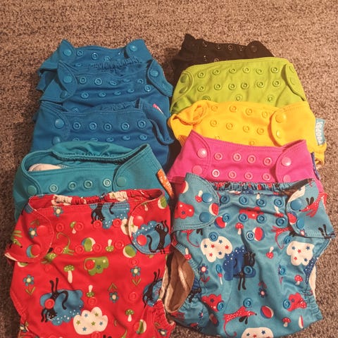 Selger 11 brukte ImseVimse tøybleier (All-in-One). Bleiene er godt brukt, men helt funksjonelle, og stoffet er fortsatt fint.