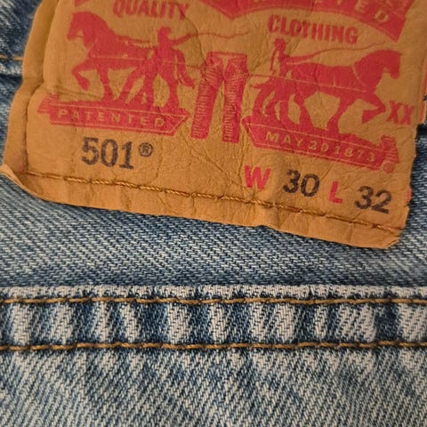 Levi's 501 bukse i brun, laget av bomull. Buksen har størrelse M/L og midjemål W32.