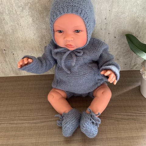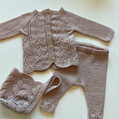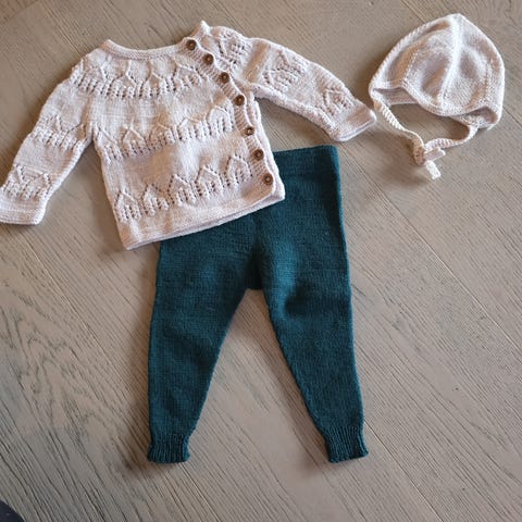 Det fineste hentesettet fra Garntopia, strikket i nydelige Sunday fra Sandnes Garn. 100% merinoull holder en liten skatt god og varm. Settet inneholder jakke, bukse og lue/kyse🤍